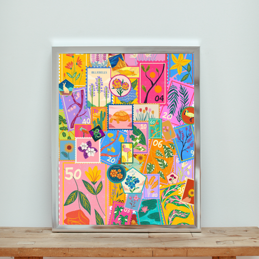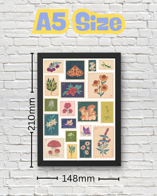 Botanical Postage Stamp Wall Art Print – Country Core Nature Décor with Mushrooms, Flowers, Insects & Herbs