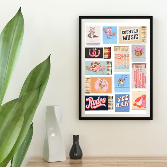 Girly Country Matchbox Wall Art Print – Western Y2K Cowgirl Décor with Boots, Cactus, Disco Ball & Rodeo Vibes