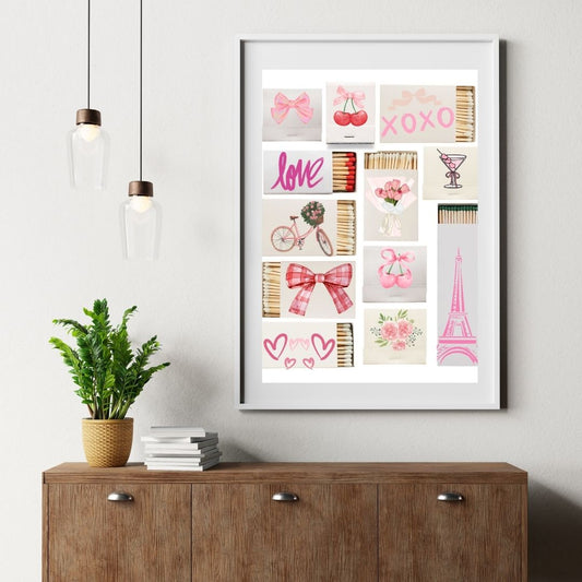 Girly Matchbox Wall Art - Pink Aesthetic Décor - Cherry, Bow, Eiffel Tower, Love Print