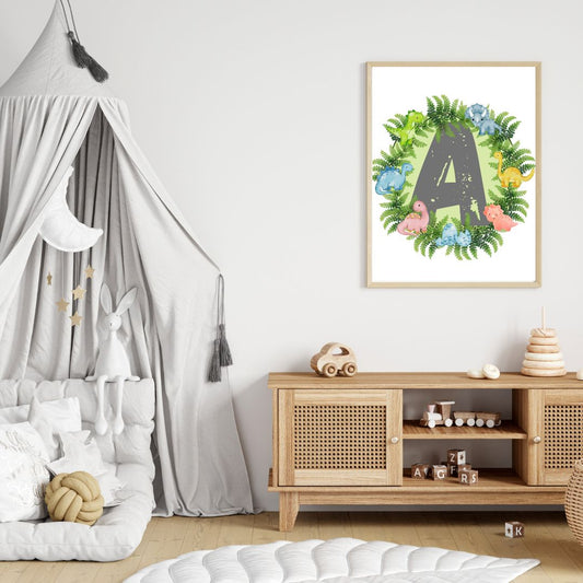 Dinosaur A-Z Alphabet Monogram Wall Art Print – Personalized Prehistoric Nursery Décor, Kids Room Printable, Educational Dinosaur Name Initial Poster