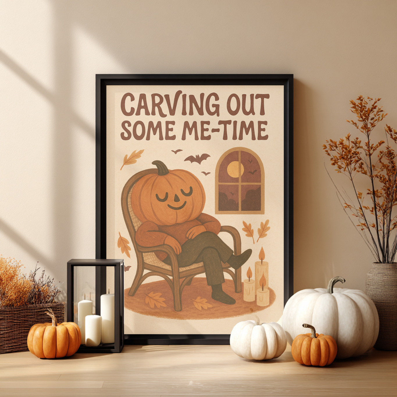 Add a playful touch of spooky charm to your home with this “Carving Out Some Me-Time” Halloween wall art print! Featuring a cute yet slightly creepy fall-inspired design, this neutral poster is perfect for adding festive Halloween vibes without overwhelming your space.